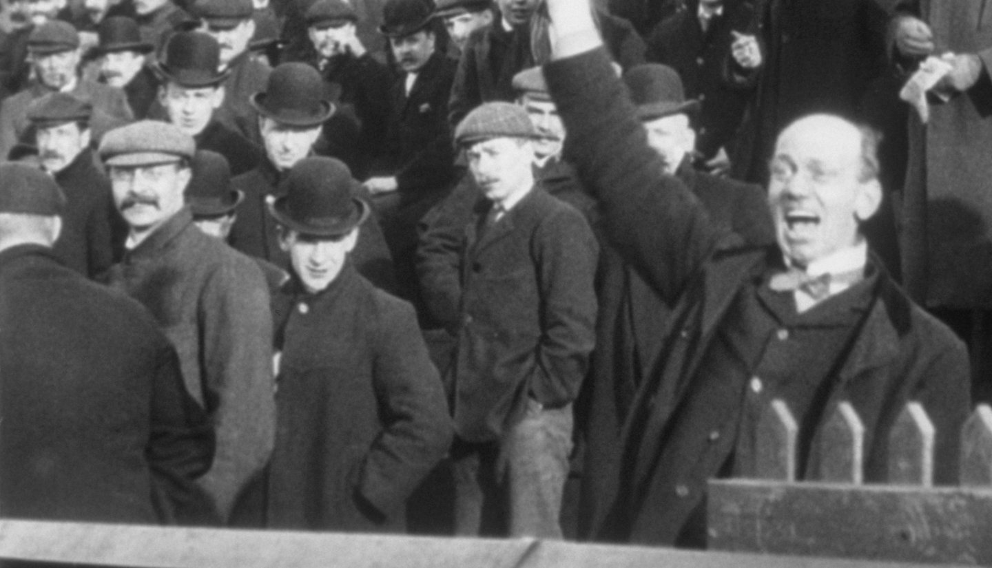 Sport was an increasingly booming industry in the early 20th Century. Banks of mud were gradually replaced by covered stands, filled by larger (overwhelmingly male) crowds of spectators thanks to growing leisure time. It was mostly these crowds, and the prospect of drawing them to paid screenings, that attracted Mitchell & Kenyon - which explains why their cameras were so often pointed at the terraces.